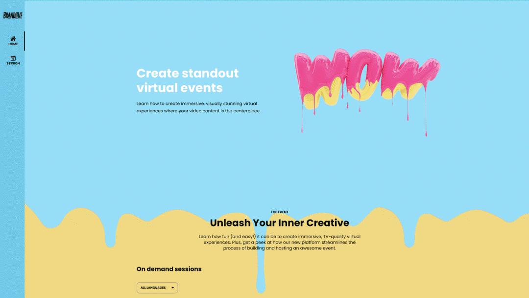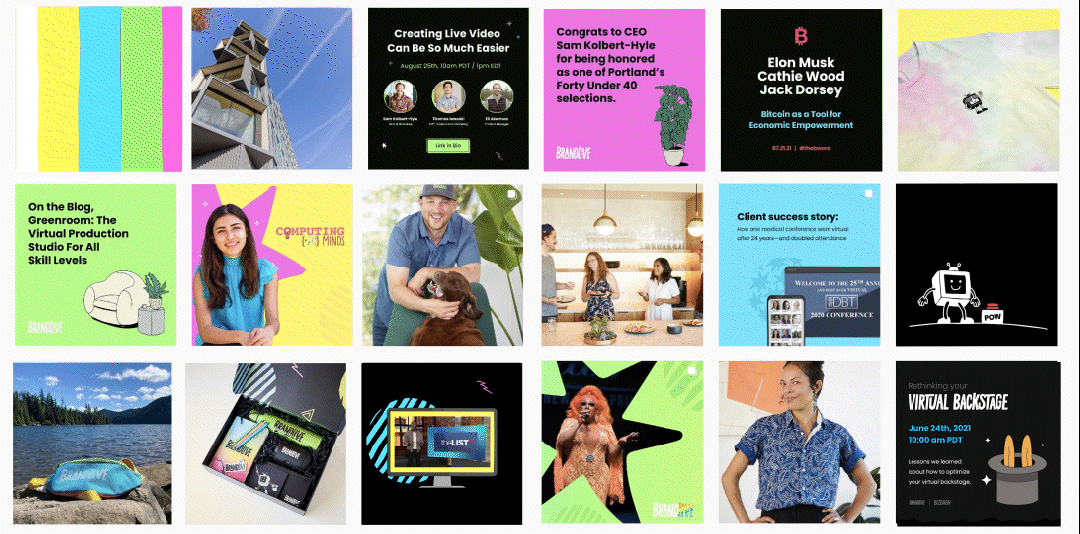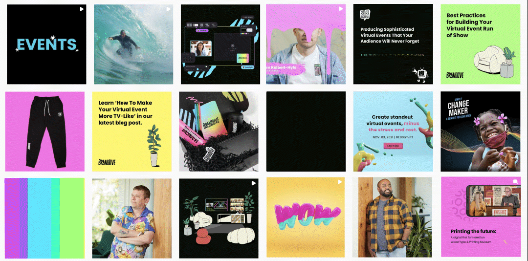 While dozens of internal only events take place, several live public events also showcase products hosted directly on Brandlive's platforms. For these, the work included designing event pages, creating social content, and developing an In Living Color themed walk up intro for the event itself.